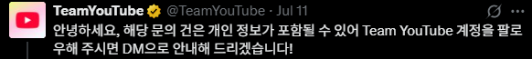 2. 그럼 팀유튜브에서 계정을 팔로우 하고, 개인정보가 포함되어 있으니 DM을 보내달라는 메시지가 옵니다.