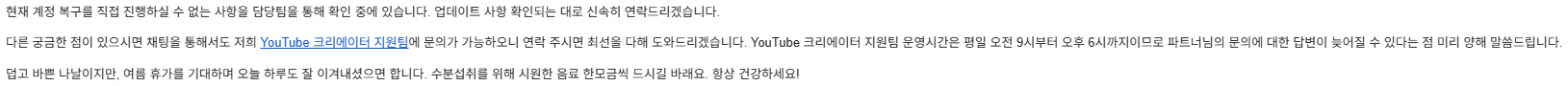이렇게 답변이 오는데 저 링크로 이동하여 신고를 진행하시면 됩니다. 신고서류는 동일하지만 저 링크는 72시간 이후에는 접속할 수가 없습니다. 신고서류에는 아까 말씀드린 유튜브 주소 뒤에 UC로 시작하는 채널명이나 @로 시작하는 핸들명, 그리고 유튜브 수익을 받고 계시다면 PUB-로 시작하는 핀번호, 본인이 자주 사용하던 IP주소, 자주 접속하던 기기, 자주 접속하던 동네 등을 상세하게 기재하게 됩니다. 그리고 제출하게 되면 이메일로 회신이 옵니다. 만약 해킹이 된 것이 맞다면
