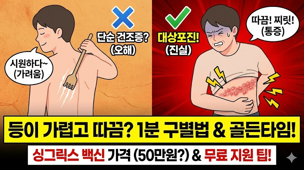 등이 가렵고 따끔하다면?" 단순 건조증 vs 대상포진 구별법 & 싱그릭스 예방접종 가격(2026년 기준)