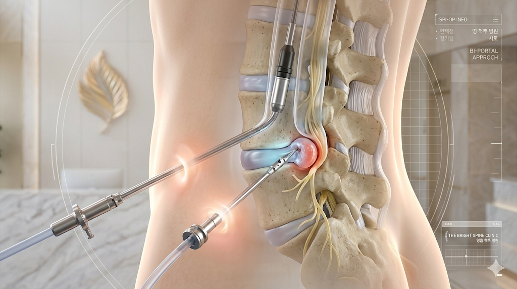 | 수술 원리 및 장점 | - 등에 약 5mm 크기의 작은 구멍 2개만 뚫습니다. - 한쪽 구멍으로는 초고화질 내시경 카메라를 넣어 시야를 확보하고, 다른 쪽 구멍으로 미세 수술 도구를 넣어 튀어나온 디스크만 정밀하게 긁어냅니다. - 절개가 작아 수술 다음 날부터 보행이 가능할 정도로 회복이 빠릅니다. |