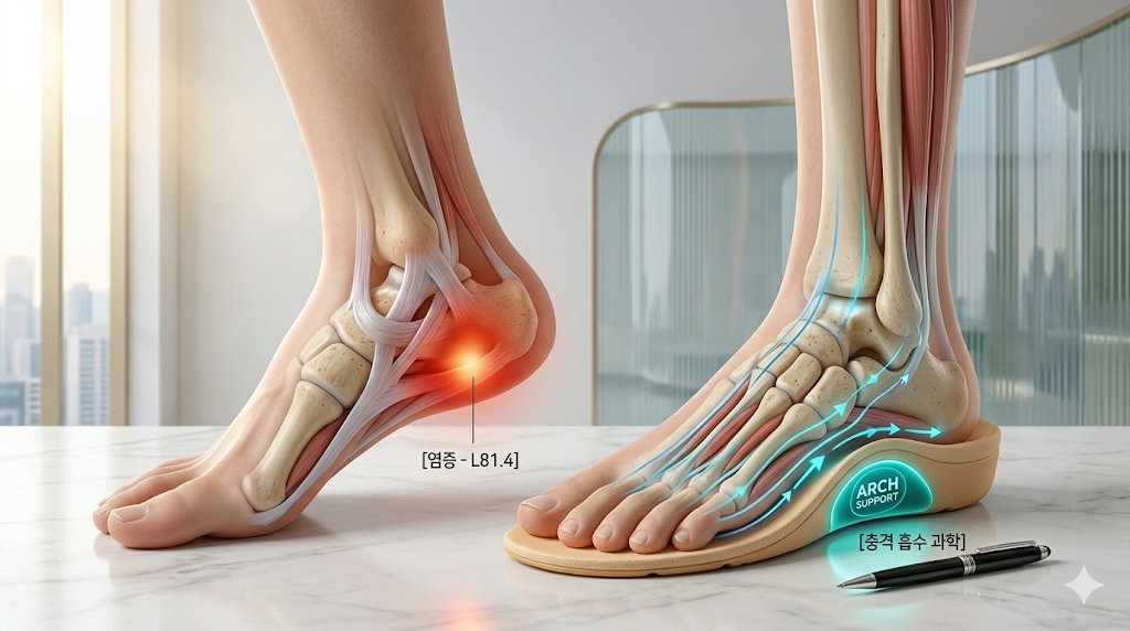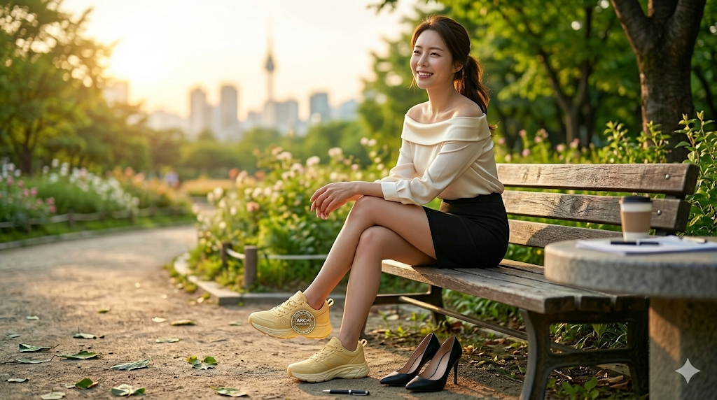 💡 가장 확실한 극복 꿀팁: 출퇴근길에는 정장이나 오피스룩을 입었더라도 무조건 푹신한 기능성 운동화를 신으세요. 회사에 도착해서 자리에 앉아있을 때만 구두로 갈아 신는 것이 발바닥 생명을 연장하는 유일한 방법입니다. 또한 매일 아침 침대에서 내려오기 전, 수건을 이용해 발끝을 몸쪽으로 당겨주는 스트레칭을 꼭 해주셔야 합니다.