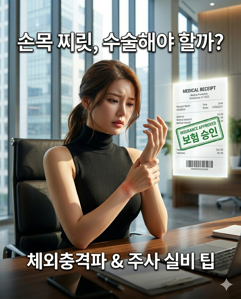 손목 수술은 회복 기간도 길고 후유증이 남을 수 있어 수술 전 '비수술 치료'로 신경 염증을 잡는 것이 핵심입니다. 오늘은 수술 없이 손목을 살려내는 '체외충격파와 DNA 주사'의 원리를 알아보고, 10만 원이 훌쩍 넘는 이 비싼 치료비들을 실손보험(실비)으로 알차게 돌려받는 청구 꿀팁을 모두 정리해 드립니다.